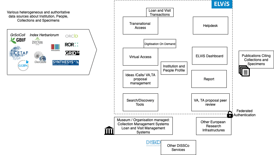 Bringing in disparate and heterogeneous datasets on institutions, people, collections and specimens, ELViS will provide a service that handles various stages of the research data life cycle. For example, collaborating on TA/VA ideas and proposal submission and review, facilitating digitisation initiatives, enabling comprehensive loans and visits management, tracking usage metrics, and providing various reporting, dashboard features. This is a complex and evolving process that requires long term vision, collaborations across different institutions and sustainable technical planning. Under the auspices of the SYNTHESYS+ project and within the DiSSCo framework, this vision will be materialised.