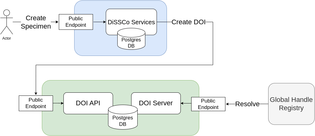 An actor looking to publish a Digital Specimen may do so through DiSSCo services. DiSSCo services call our DOI API endpoint, which publishes the record (including the FDO Profile!) to the DOI database. Anything published to that database can be looked up by the global handle infrastructure, allowing the identifiers to be resolved.