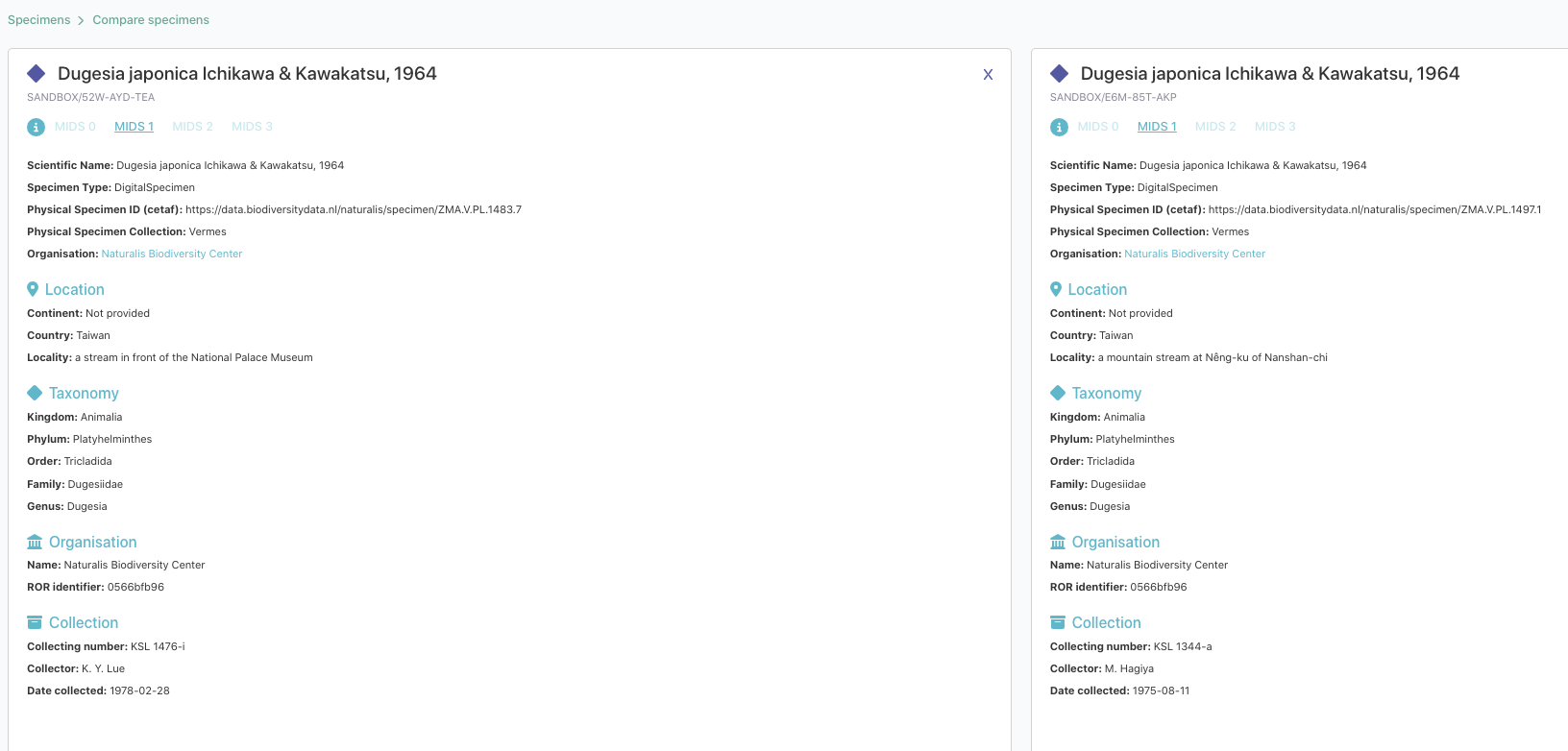 DiSSCover Sandbox interface: Our DiSSCo sandbox has gone through several iterations (both front and backend). We added different search, filter and compare features to easily find the Digital Specimens: